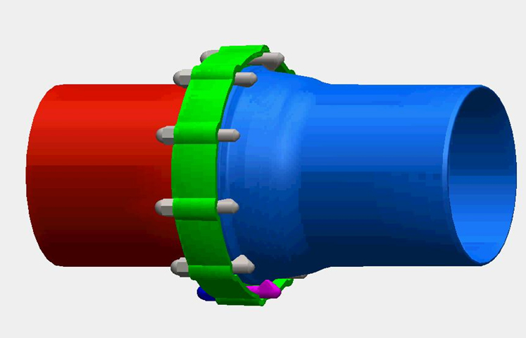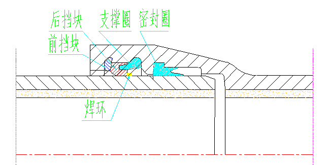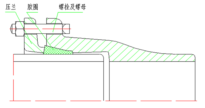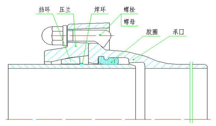 采用T型接口的密封結(jié)構(gòu),通過焊環(huán)、擋環(huán)、壓蘭相互配合和鉤頭螺栓緊固實(shí)現(xiàn)自錨,允許工作壓力為1.0MPa、1.6MPa和2.5MPa。