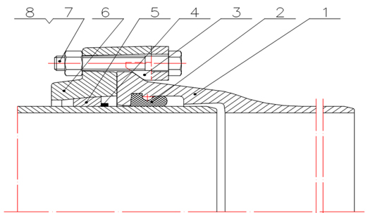 1.球鐵管;2.T密封圈 3.替代勾頭斜壓塊;4;焊環(huán);5、擋環(huán);6、壓蘭;7、高強(qiáng)度螺栓及螺母