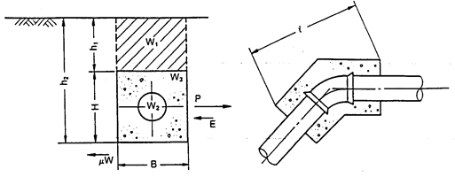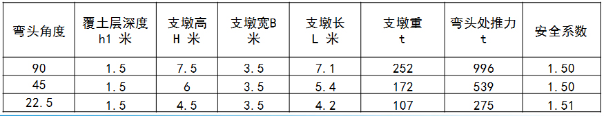 大型管道工作壓力大,相應(yīng)支墩大,并且工期長,如果設(shè)定土壤條件為:密度為1.6t/m3,摩擦系數(shù)為0.5,內(nèi)摩擦角為30°,覆土層厚度為1.5m,假定DN1800口徑的鑄管,在2.5MPa的試驗(yàn)壓力。 22.5°和90°彎頭處按1.5倍的安全系數(shù)進(jìn)行混凝土支墩設(shè)計(jì),如果混凝土密度按照2.3t/m3計(jì)算,支墩尺寸為: