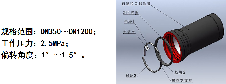 采用T型接口的密封結(jié)構(gòu),通過分塊擋環(huán)(擋塊)與承口內(nèi)增加的擋塊室的配合利用焊環(huán)實(shí)現(xiàn)錨固連接;主要應(yīng)用C25級(jí)別的DN1400~2000自錨管,DN1400~1800偏轉(zhuǎn)角為1°,DN2000偏轉(zhuǎn)角為0.5°。