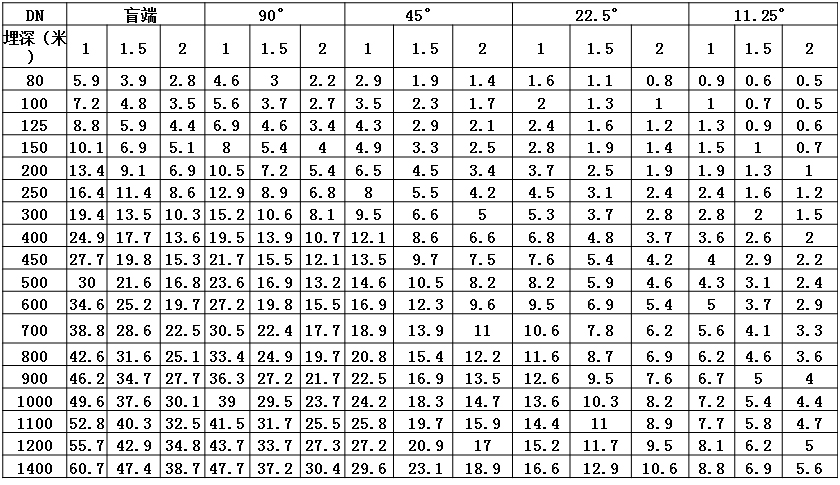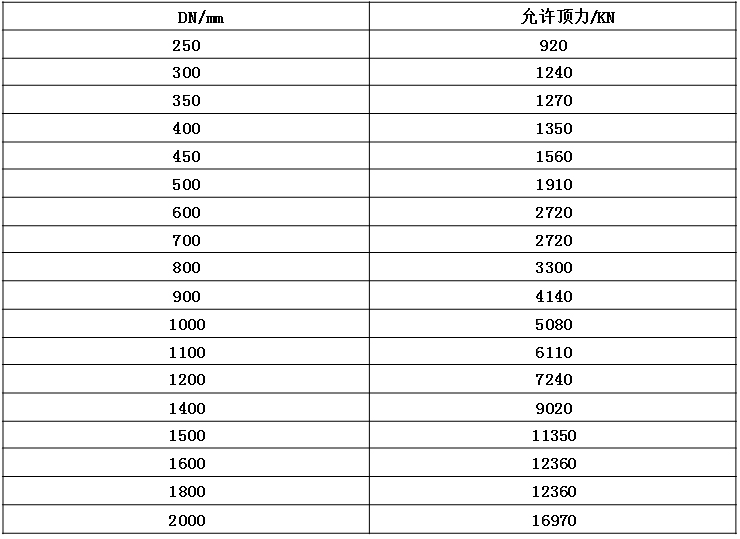 2)下表適用于普通土壤,土壤的內(nèi)摩擦角為30°,打壓壓力為10Bar,安全系數(shù)為1.2,普通金屬鋅涂層或金屬鋅和普通終飾層的埋地管線。
