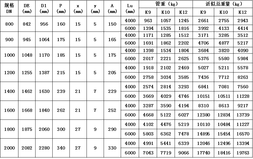 3)鑄管外有PE套或外涂層為聚氨酯時(shí),可以在表中數(shù)據(jù)的基礎(chǔ)上乘以1.9;如果需要更準(zhǔn)確的數(shù)據(jù)請(qǐng)與我們聯(lián)系。
